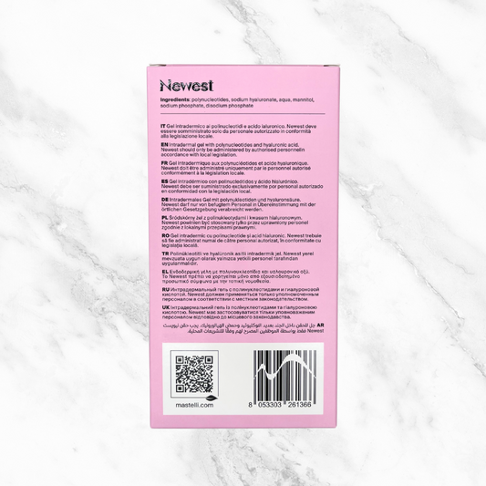 Newest is a next-generation skin booster that combines the regenerative power of polynucleotides with the deep hydration of hyaluronic acid, offering a comprehensive approach to skin rejuvenation. Its unique formula works at a cellular level to stimulate fibroblast activity, enhance collagen and elastin production, and visibly improve skin texture, firmness, and elasticity. Enriched with mannitol for antioxidant protection, Newest helps combat signs of ageing, scarring, and dehydration while supporting tissue repair. The convenient 2ml pre-filled syringe allows for effective treatment of multiple areas - including the face, neck, and décolleté - making Newest a trusted, versatile solution for long-lasting, radiant results.