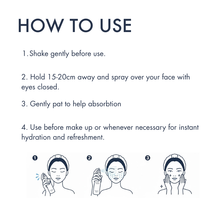 Hold 15–20 cm from the face and spray evenly with eyes closed.